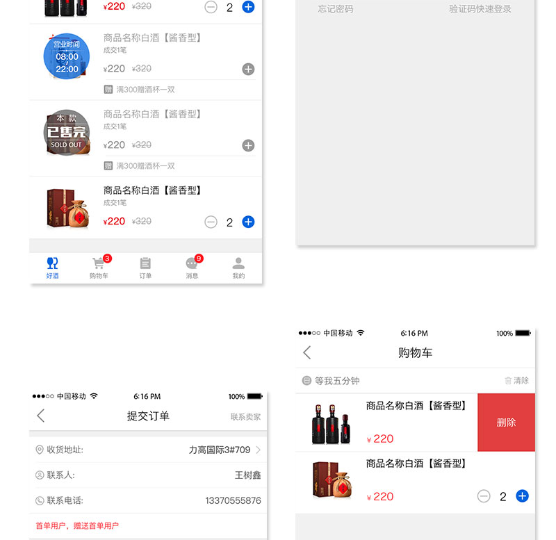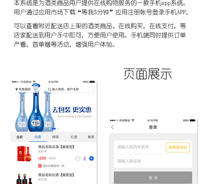 本系統(tǒng)是為酒類商品用戶提供在線購物服務的一款手機APP系統(tǒng)。用戶通過應用市場下載“等我5分鐘”應用注冊帳號登錄手機APP,可以查看附近配送店上架的酒類商品、在線購買,在線支付,等店家配送到用戶手中即可,方便用戶使用。手機端同時提供訂單產(chǎn)看,首單贈等活動,增強用戶體驗。