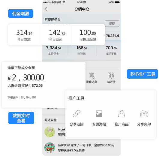 通過分銷獎勵引發裂變傳播,讓老用戶帶來更多新用戶。一帶十、十帶百,不用花錢推廣也能獲得源源不斷的新用戶。