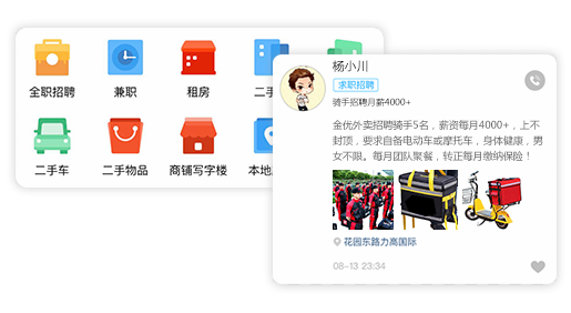 匯聚同城話題、同城招聘、同城房產、同城交友等功能板塊。讓信息服務成為平臺獲利的一種方式,并且同城信息可以聚集了海量用戶資源,方便平臺開展更多業務,讓平臺能夠快速盈利成長。