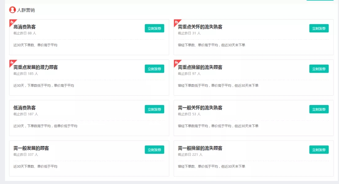 一般來說,如果某個用戶每月在我們平臺超過10次以上消費,我們可以將該用戶算作“粉絲用戶”(流失幾率非常低),所以對用戶消費頻次的培養對我們平臺運營來說至關重要。關鍵點要抓住從“輕度流失客戶”到“熟客”再到“粉絲用戶”的轉化。精準營銷功能可以對用戶進行分層,做到對“輕度流失客戶”高度補貼,通過重點關懷的方式,帶動“輕度流失客戶”的消費頻次。綜合來講,精準營銷功能可以覆蓋不同消費水平的用戶,并做分層。通過針對性補貼營銷,帶動低頻消費,培養成高頻消費。